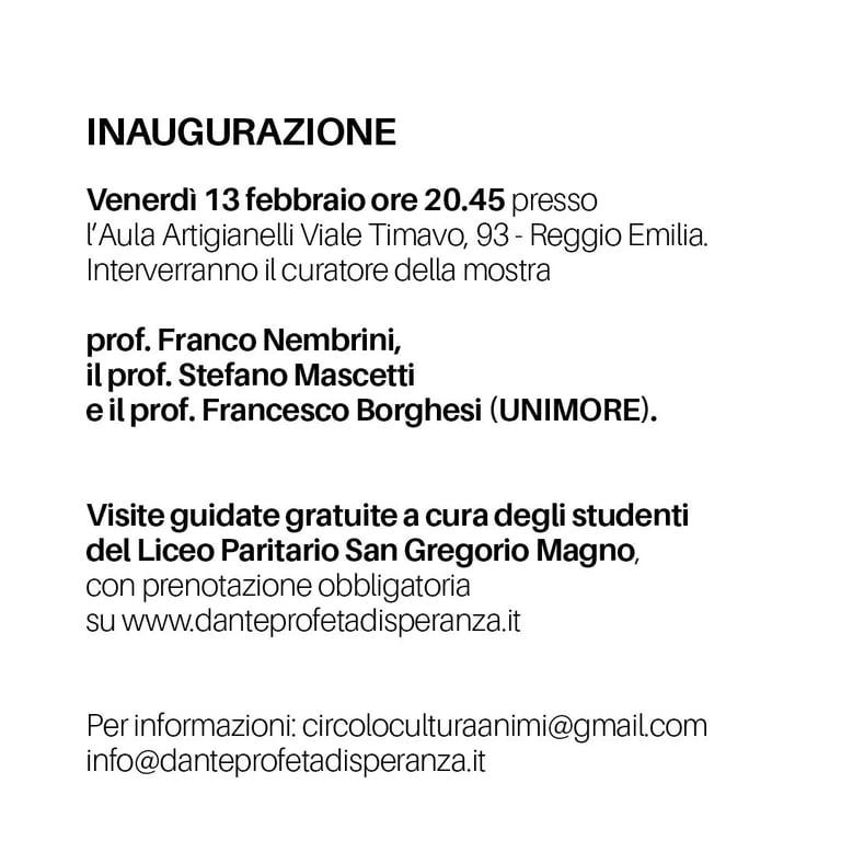 Ringraziamo tutti coloro che hanno partecipato con curiosità, passione e apertura. Il Circolo Cultura Animi è grato a chi ha reso possibile questa esperienza, in special modo ai ragazzi del Liceo San Gregorio Magno che hanno guidato i visitatori. Grazie a chi, varcando quella soglia, ha portato con sé domande, stupore e desiderio di verità. Con Dante continuiamo a camminare, custodendo la speranza che la sua parola accende.