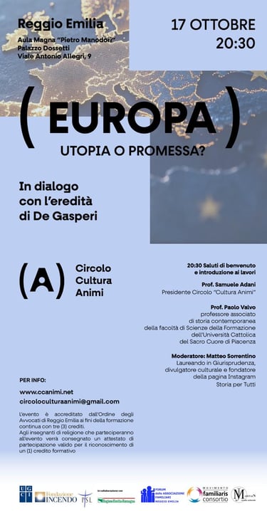 Venerdì 17 ottobre, ore 20.30 nell'Aula Magna "Pietro Manodori", presso Palazzo Dossetti Viale Antonio Allegri, si terrà l'evento del Circolo Cultura Animi dal titolo: "EUROPA UTOPIA O PROMESSA?" in dialogo con l'eredità di De Gasperi padre fondatore dell'ltalia democratica e dell'Unione Europea.